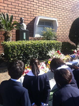 創立者濱野重郎先生のお誕生日は11月14日です。その日は、創立者生誕記念日として休業日と決めています。今日は、そのお誕生日をお祝いする偲ぶ会が、幼稚園と初等部、中等部で行われました。子どもたちは真剣に理事長先生のお話を聞き、最後は学園歌を歌って先生を偲んでいました。