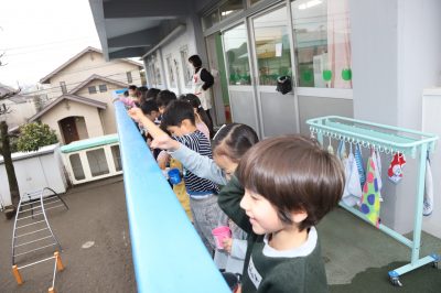 クラスごとに分かれて豆まきを行いました。