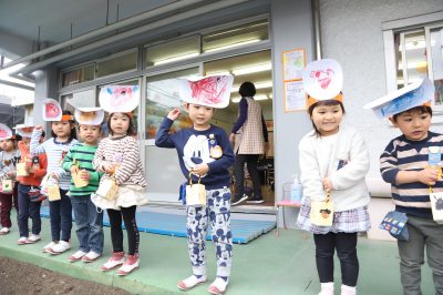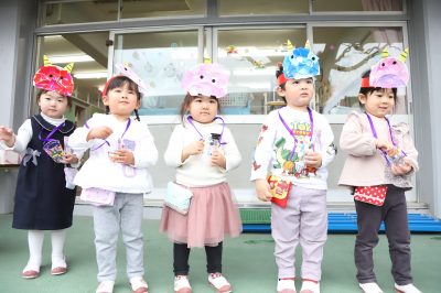 子どもたちは、制作した鬼のお面や、手作りの豆入れを身につけ、
