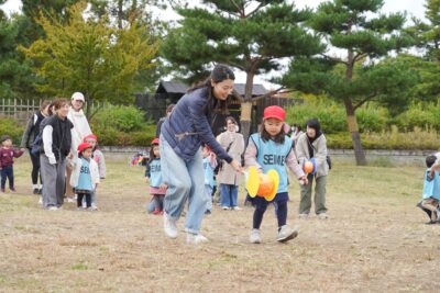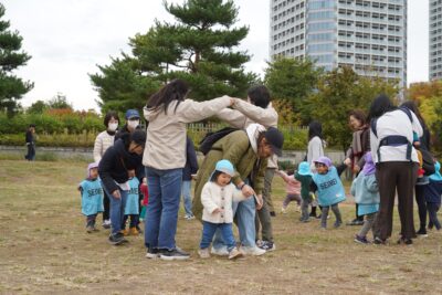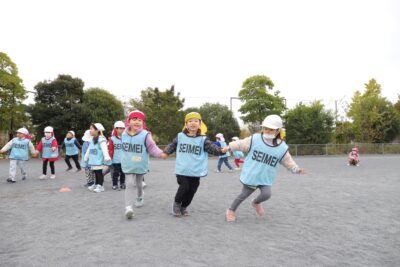 集団遊びである「手つなぎ鬼」をしました。友だちと気持ちを合わせて手をつなぎ、鬼ごっこを楽しみました。