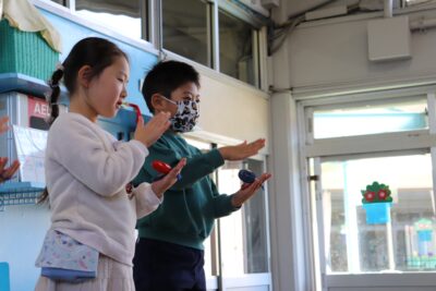 楽器演奏では、鈴、カスタネット、それぞれのリズムを乱れることなく、打つことができました。