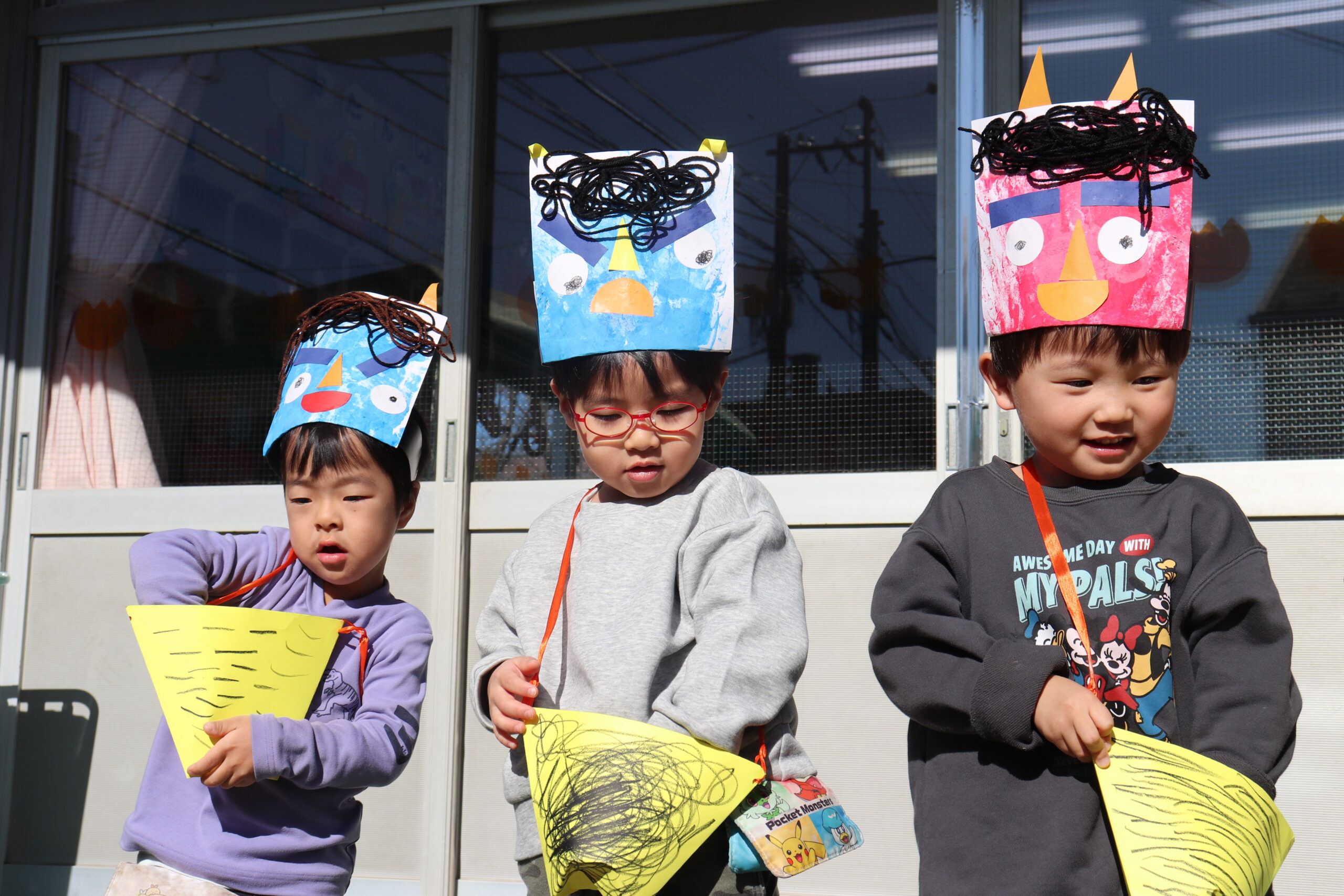 ペープサートを使用して、節分について学び、豆まきの歌を歌ったり、クラスごとに豆まきを行ったり、行事を楽しむことができました。