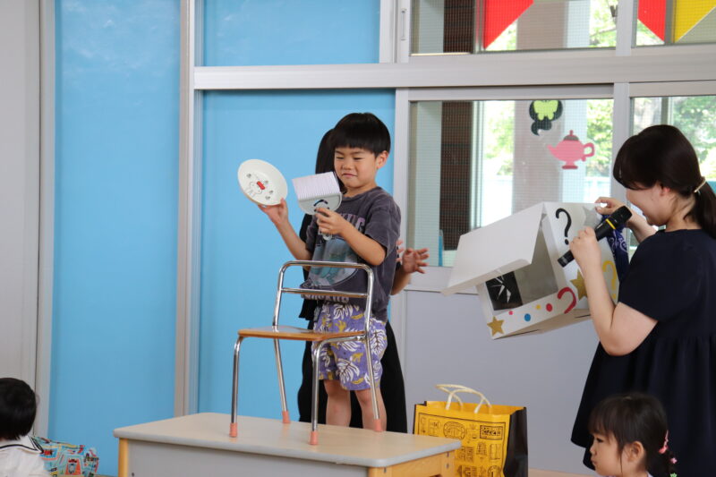 初めは、少し緊張した様子も見られましたが、後半の「箱の中身は何だろな?」ゲームでは、箱の中に手を入れて正解することができました。